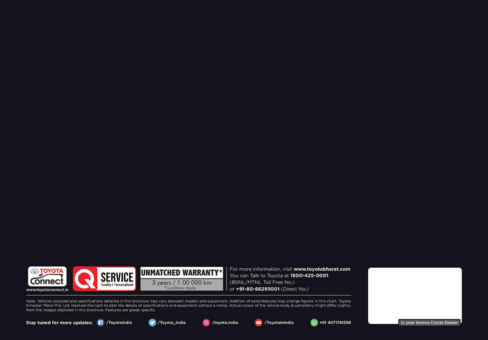 Disclaimer:- Vehicle body and accessories colour might differ from the printed photos. Toyota Kirloskar Motors Pvt. Ltd. reserves the right to alter details of specification and equipment without notice. Check with your nearest Toyota dealer for warranty policy on accessories.